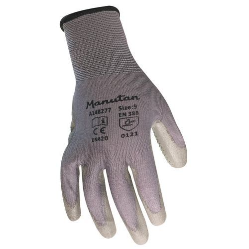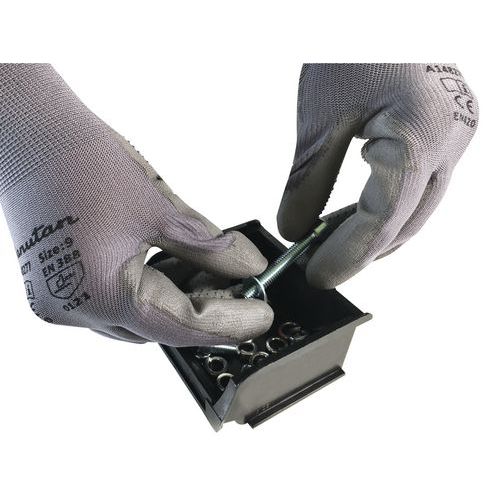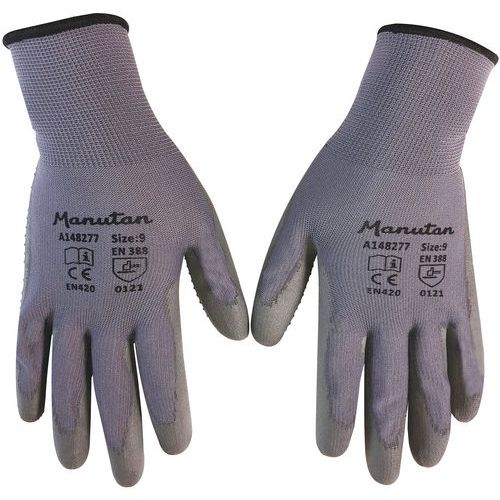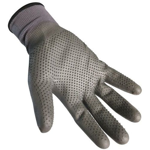 Rétegzett munkakesztyű PVC pöttyökkel mindennapi használatra. A poliuretán réteg a PVC pöttyökkel lefedi a tenyeret és az ujjakat. A pöttyök csökkentik a megmarkolt tárgy kicsúszásának veszélyét. A rugalmas ujjgallér megakadályozza a kesztyű lecsúszását és kényelmes viselést biztosít.