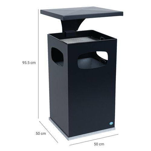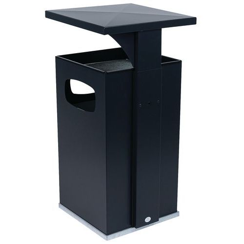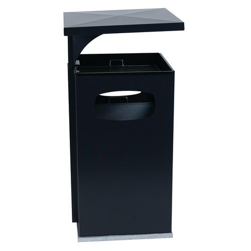 Kültéri szemetes kosár horganyzott acélból hamutartóval több színváltozatban. Szemetes kosár horganyzott acél betéttel, a felülete galvanizált a cigaretta csikkekre. A szemetes kosarat tető védi az eső ellen. Belső tartállyal horganyzott acélból, amely füllel rendelkezik. UV sugárzás álló epoxi festékkel felületkezelve, ami színtartósságot biztosít. Kulccsal zárható.