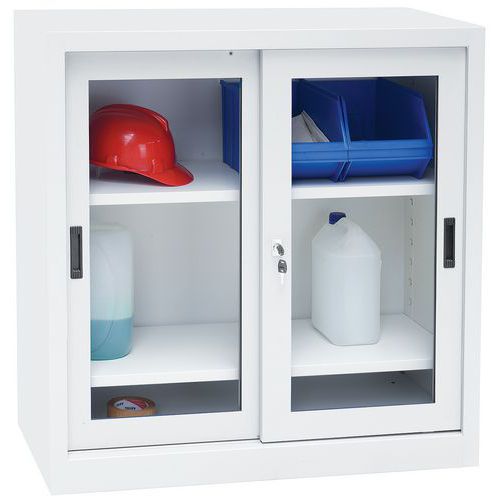 Alacsony fém szekrények üveges tolóajtóval, alkalmasak irodákba, laboratóriumokba, műhelyekbe és egészségügyi intézményekbe. Az acéllemez szerkezetű szekrények tetszőlegesen állítható magasságú polccal vannak felszerelve. Az ajtó hengerzárral zárható.