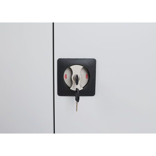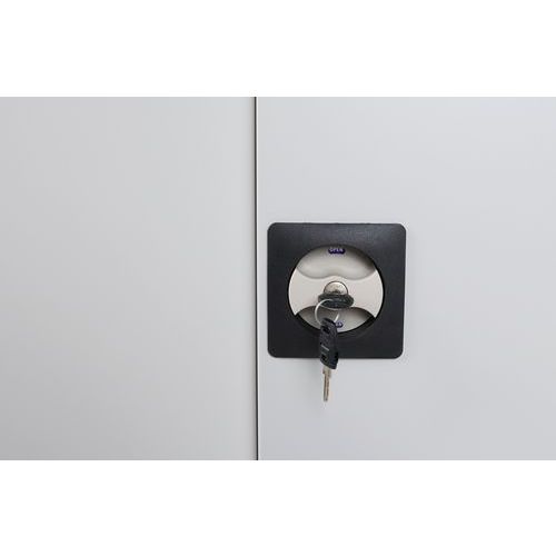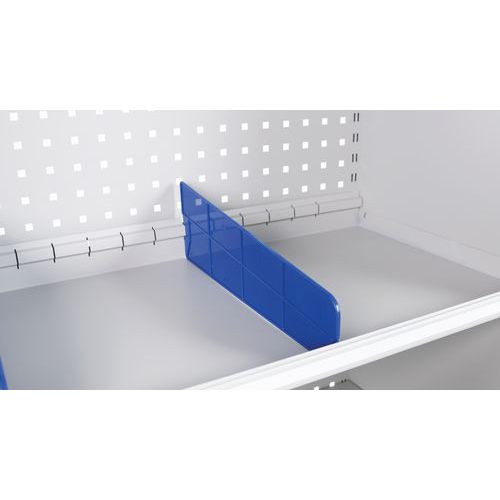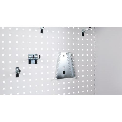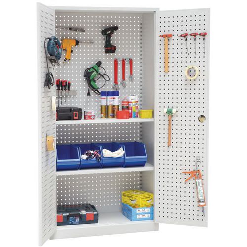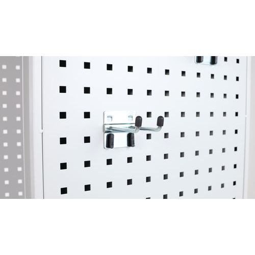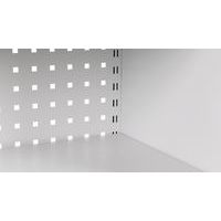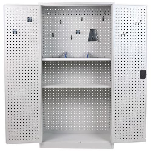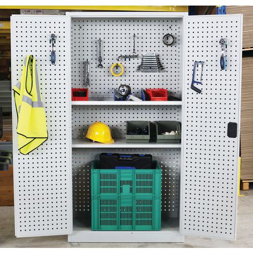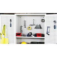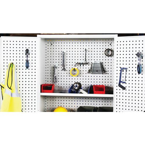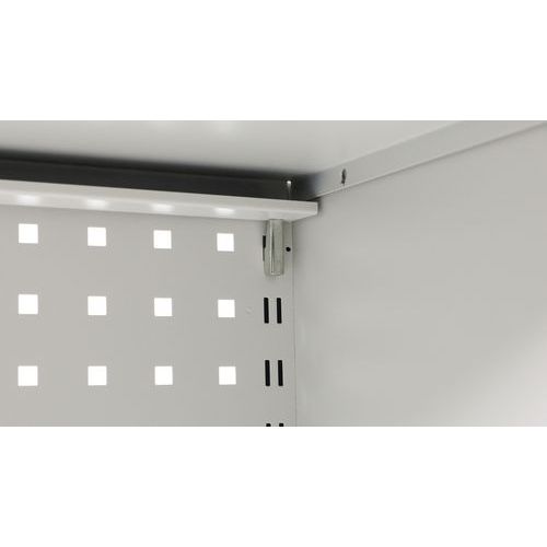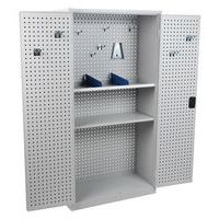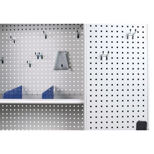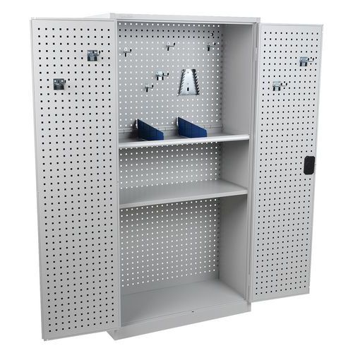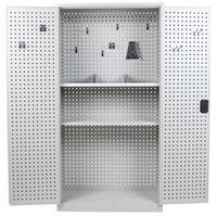 A két polcos műhelyszekrények acéllemezből készülnek. A fémszekrények hátfala perforált panellel van felszerelve, a szerszámtartók és az anyagtárolók dobozok rögzítésére. A lemez szekrények kétpontos, hengerzárral felszerelt zárszerkezettel zárhatók. Az ajtónyílási szög 180 °. A polcok 3,6 cm-es lépésközben állíthatók.. Szintkiegyenlítő csavarok a padlóegyenetlenségek kiegyenesítésére.