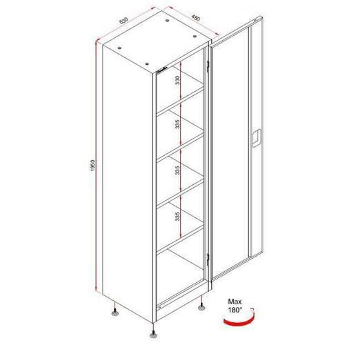 Hegesztett acéllemez szekrények akár 180°-os ajtónyitással, elsősorban műhelyekbe és raktárakba.