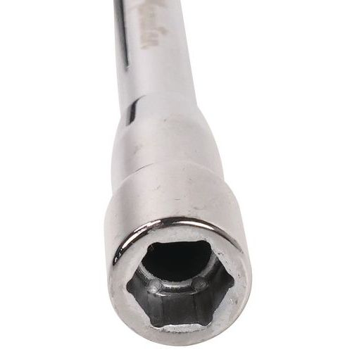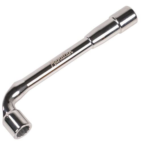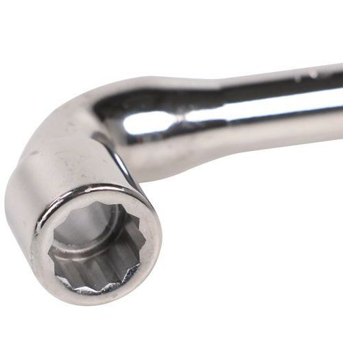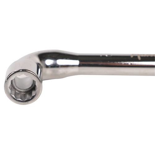 Hajlított csőkulcs különböző méretekben. 12 pontos könyökoldal, 6 pontos hosszú oldal. Króm-vanádium acélból, fényes felületű.