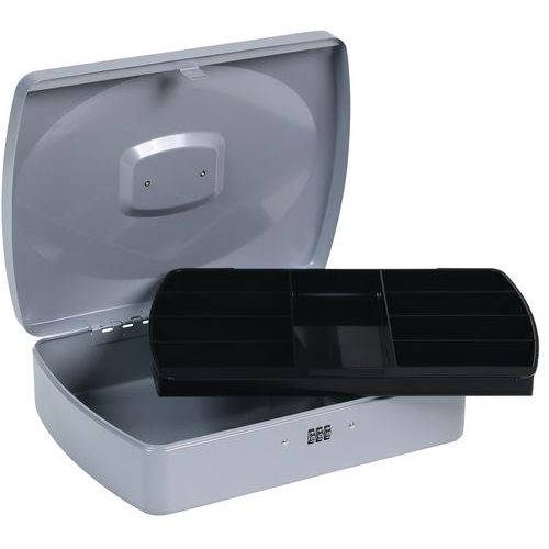 Hordozható pénzkazetták kódzárral különböző színkivitelben. Kivehető elválasztóval, kilenc rekesszel.