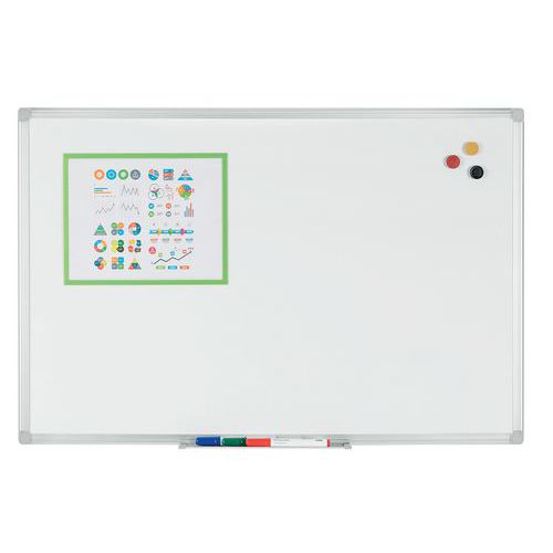 Lakkozott fehér írótábla. Mágneses - felületére mágnessel rögzíthetők a dokumentumok. Tartós alumínium kerettel. Szárazon ruhával könnyen törölhető. Gyorsan és egyszerűen falra szerelhető a rejtett előfúrt rögzítőlyukakkal.