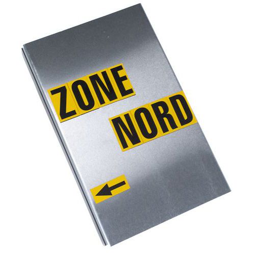 Nagybetűket tartalmazó mágneses címkék polcállványok jelöléséhez. Egyszerű polcállvány-leírás módosítás a betűk kicserélésével.