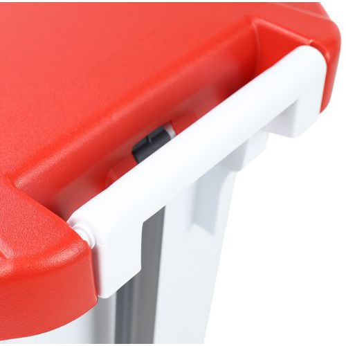 Pedálos műanyag kosarak színes fedőkkel, alkalmasak élelmiszeripari üzemekbe. A kosarak két műanyag görgővel rendelkeznek. A fedőnyitás pedállal történik a kosár elülső oldalán.