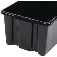 Fekete dobozok tárgyak, iratok, áru szállítására vagy tárolására. Újrahasznosított polipropilénből készül. Több darab is egymásra rakható.