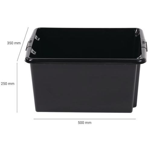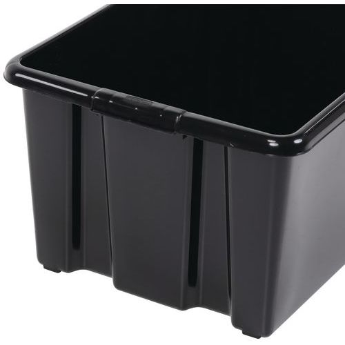 Fekete dobozok tárgyak, iratok, áru szállítására vagy tárolására. Újrahasznosított polipropilénből készül. Több darab is egymásra rakható. Gyártói garancia az ügyfélnek : 10 év