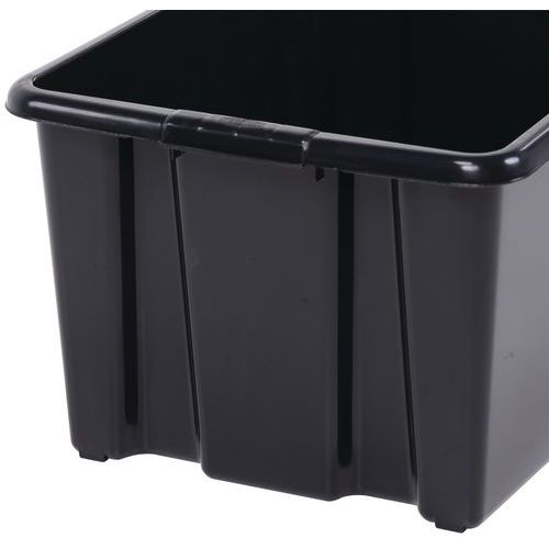 Fekete dobozok tárgyak, iratok, áru szállítására vagy tárolására. Újrahasznosított polipropilénből készül. Több darab is egymásra rakható.