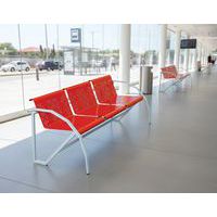 Háromszemélyes várótermi pad. Fém szerkezet epoxi felületkezeléssel, alumínium színben. A szerkezet ívelt oldalai karfákat alkotnak. Perforált fémlemez ülőlapok különböző színekben.