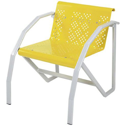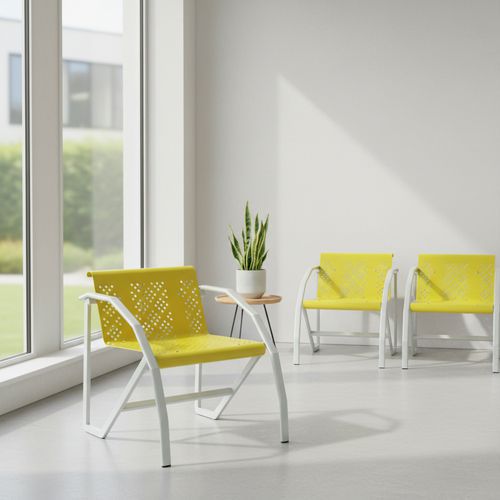 Tiszta fém várótermi szék. Fém szerkezet epoxi felületkezeléssel, alumínium színben. A szerkezet ívelt oldalai karfákat alkotnak. Perforált fémlemez ülőlapok különböző színekben.