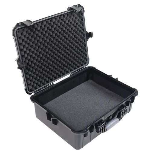 Műanyag koffer acél pántokkal, ellenáll a víznek és pornak. 90°-os önzáró rozsdamentes acél zsanérok. Zárása a fogantyú alatti gomb megnyomásával. A belső tok kárpitozott habbal van ellátva a tárgyak még nagyobb védelméért. Belső méretek: 480 x 370 x 199 mm. Elsősorban szerszámok és szerelőanyagok tárolására.