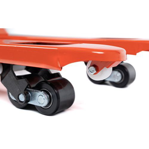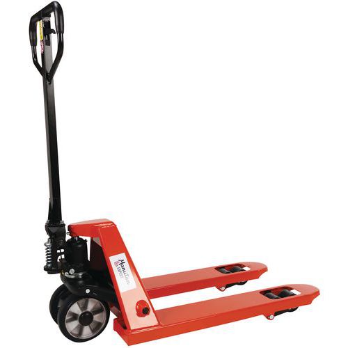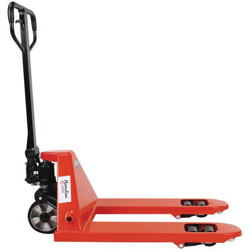 Ekwo raklapszállító kocsi megnövelt teherbírással. Alkalmas áru kirakodására és szállítására raklapokon raktárakban, üzletekben stb. A lerövidített villák alkalmasak nem standard méretű raklapok kezelésére. Rágördülő görgők, karbantartás nélküli hidraulika.