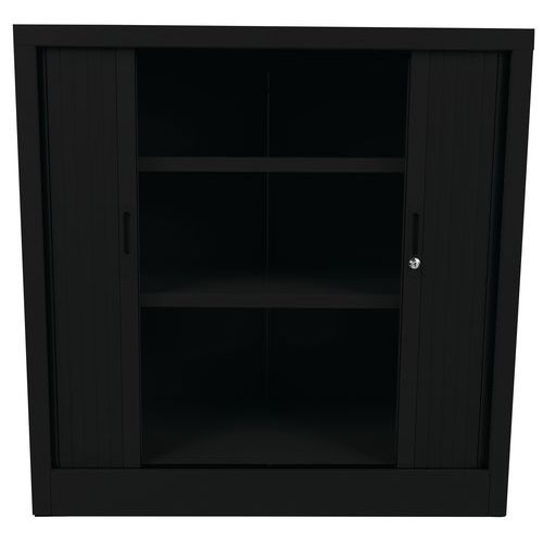 Alacsony fémszekrény mappák, prospektusok és irodai dokumentumok tárolására. Csendes redőnyös ajtó mágneses zárral. Két állítható magasságú polccal. A polcok maximális terhelhetősége egyenként 60 kg. A szekrény zárható.