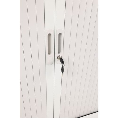 Alacsony irattartó szekrény mappák, prospektusok és irodai dokumentumok tárolására. Csendes redőnyös ajtó mágneses zárral. Két állítható magasságú polccal. A polcok maximális terhelhetősége egyenként 60 kg. A szekrény zárható.