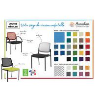 Kétdarabos fémszerkezetes konferenciaszék készlet. Légáteresztő hálóból készült háttámlával, különböző színekben. M1 tűzállóságú 100% poliészterből készült kárpitozott fekete ülőlappal. Poliéter habszivacs ülőbetéttel.