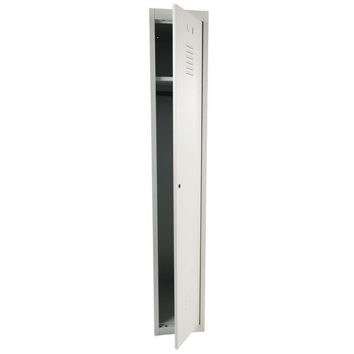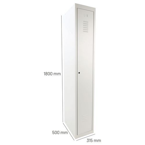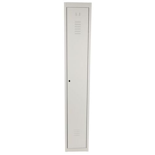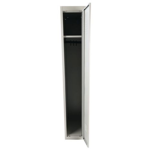 Összeszerelhető öltözőszekrény iskolai vagy munkahelyi öltözőkbe. Az ajtószárnyakat belső zsanérok tartják és 115°-ban nyithatók. Csendes záródás a műanyag csillapítóknak köszönhetően. Az ajtón lévő tartón névtábla helyezhető el. Az ajtók fedett szellőzőnyílásai biztosítják a levegőzést. A szekrény felső részében tárolópolc található és ruhaakasztó rúd két kampóval. Tiszta fém szerkezet 0,6 mm vastagságú acéllemezből. A szekrény lábazaton áll. Az öltözőszekrény-bővítmény nem rendelkezik oldalfallal, az alap öltözőszekrényhez szerelve öltözőszekrénysor hozható létre belőle. Az alapszekrényből további bővítményekkel öltözőszekrénysor hozható létre. Lemezvastagság : 6/10e Tôle épaisseur porte : 6/10e Gyártói garancia az ügyfélnek : 10 év