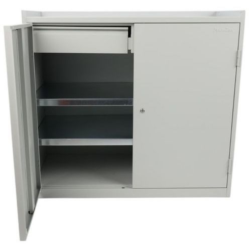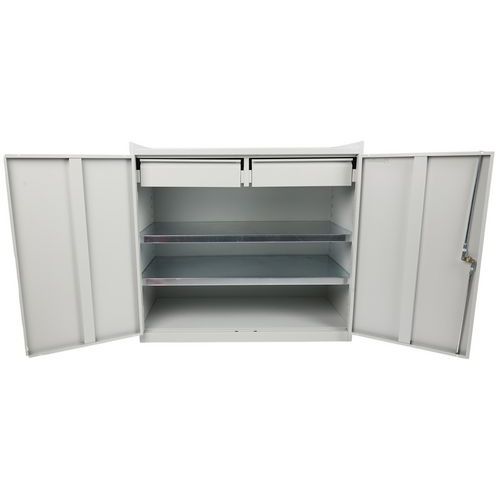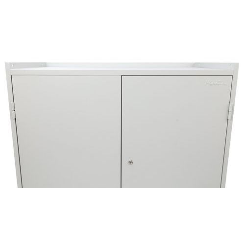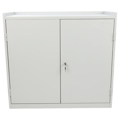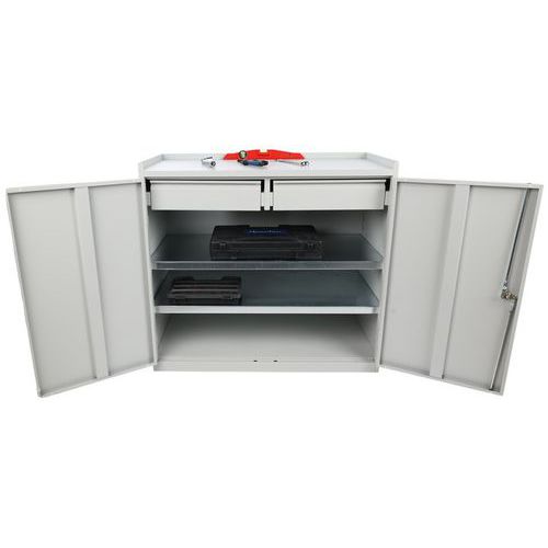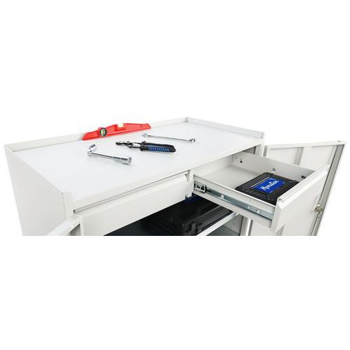 A műhely szekrény kiválóan alkalmas munkahelyi szerszámok és segédeszközök tárolására. A szekrény felső felülete magasított peremmel rendelkezik a tárgyak leesésének megakadályozására.