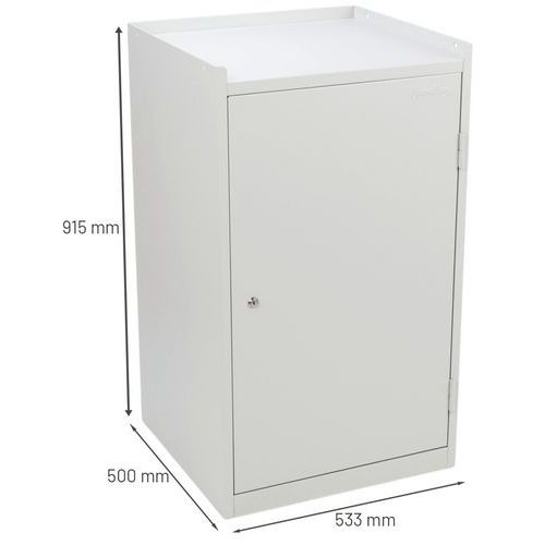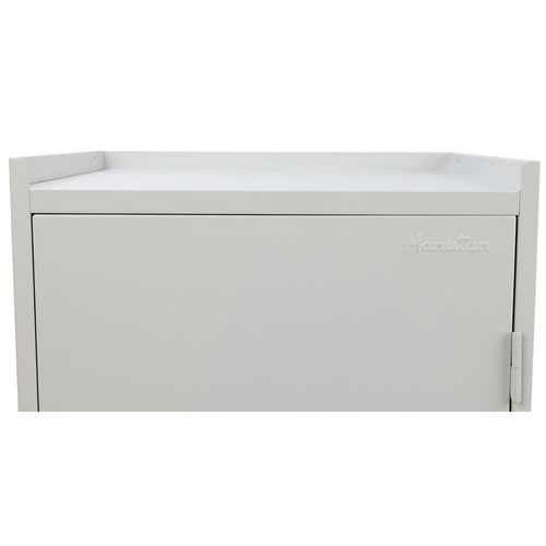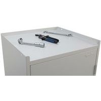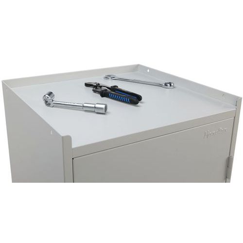 A műhelyszekrény kiválóan alkalmas szerszámok, munkahelyi eszközök, összekötő elemek és egyéb tárgyak elhelyezésére. A felső felületét magasított perem szegélyezi a tárgyak leesésének megakadályozására.