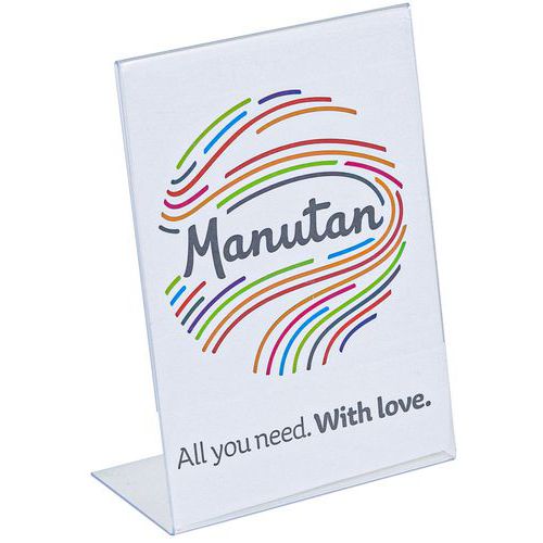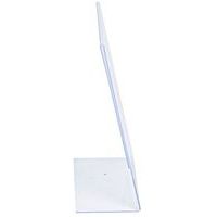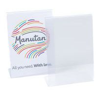 Színtelen, asztali L-típusú, álló tájolású szórólapállvány. Egyoldalú prezentáció. A prospektusok oldalról helyezhetők be.