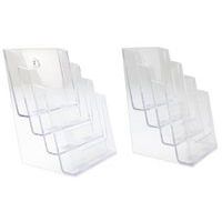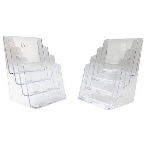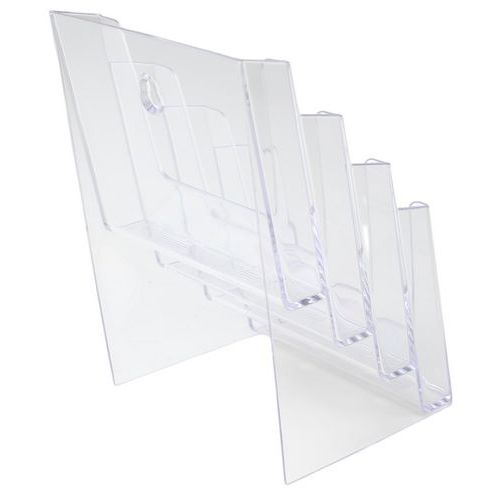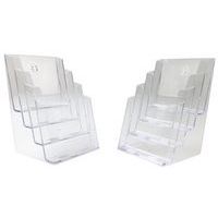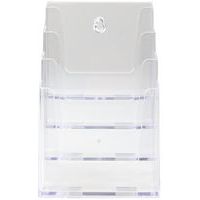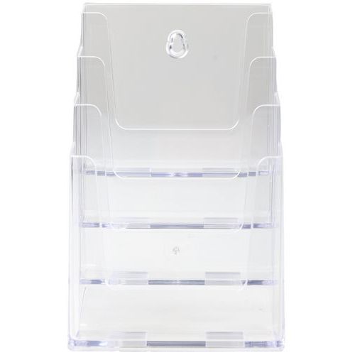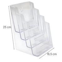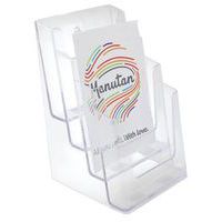 Pultos tárolóállványok szórólapra, reklámbrossúrákra és más hirdetési anyagra. Három zseb egymás mögött különböző formátumokra. Álló tájolás.