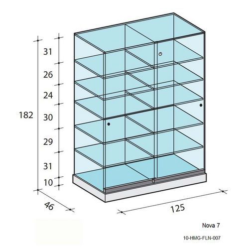 Termékbemutató vitrin két különálló résszel. 2 x öt termékbemutató polccal rendelkezik. Beépített LED-világítás mindkét részben. Nyitás tolóajtókkal. Edzett üvegből.