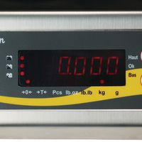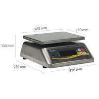 Rozsdamentes kompakt mérleg az áru tömegének ellenőrzésére raktárakban vagy boltokban. Por és fröccsenő víz elleni védőburkolattal rendelkezik. Piros LED háttérvilágítású kijelző. Integrált tölthető akkumulátor kb. 80 órás működtetéssel.