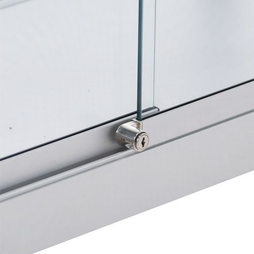 Üvegezett termékbemutató vitrin. Négy állítható üvegpolccal rendelkezik, polconként legfeljebb 8 kg terhelhetőséggel. Tolóajtó edzett üvegből. 6 mm-es, zárható. 2x LED-világítás (meleg fehér) a felső konzolban. Állítható lábak a szintezéshez. Gyártói garancia az ügyfélnek : 10 év
