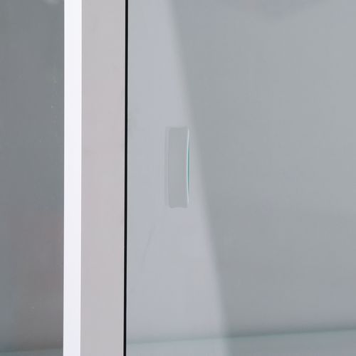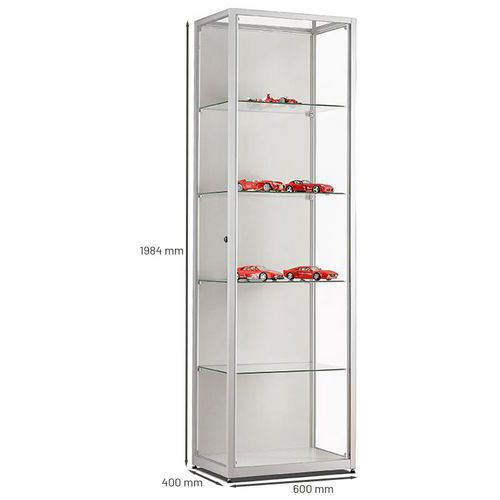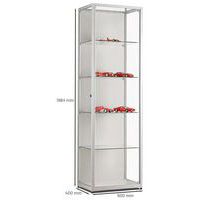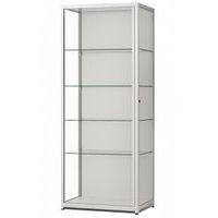 Üvegezett vitrin termékek kiállítására. Négy állítható polccal 5 mm vastag merített üvegből. A polcok max. teherbírása 13 kg. Zárható ajtóval a jobb oldalon. Két meleg fehér fényű diffúzoros LED-szalaggal ellátva. Állítható lábakon.