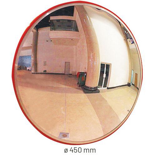 Domború tükör fémoszloppal a rosszul belátható helyeken történő biztonsághoz közlekedéshez. Narancssárga polipropilén kerettel. 48 mm átmérőjű, 3 m hosszú fémoszloppal. Beltéri és kültéri használatra egyaránt alkalmas.