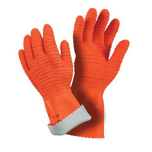Hosszabb munkakesztyű természetes latexből belső pamut betéttel. A nagyobb hossznak köszönhetően a kesztyű védi az alkar nagy részét is. Az érdes felület növeli a tárgyak markolási biztonságát. Alkalmas vegyi üzemekbe.