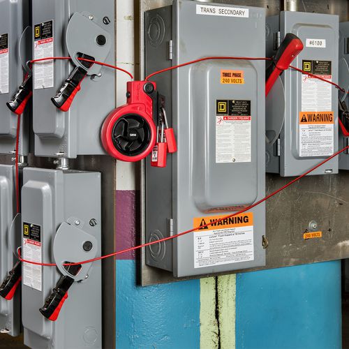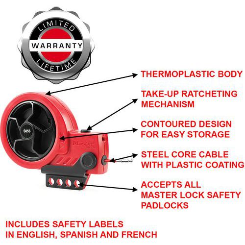 Master Lock zárszerkezet visszahúzható kábellel, ideális szelepekhez és egyéb zárrendszerekhez. Tartalmaz egy masszív, rugalmas acél testű és piros műanyag bevonatú kábelt. Integrált kábelrendező rendszerrel és feltekercseléssel tervezve. Belső beállító mechanizmussal rendelkezik, amely lehetővé teszi a kábel nagyobb feszességét – még zárható lakatok használata után is. Ellenáll a zord körülményeknek, és lehetővé teszi több eszköz egymásra rakását és szállítását.
