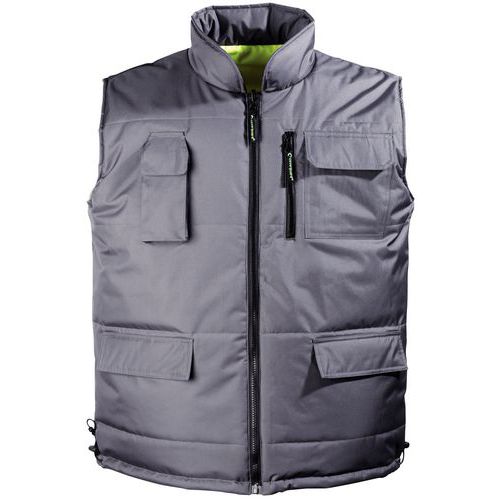 Az egyik oldalon 2 varrott fényvisszaverő csík, a másikon szürke. Sok zseb. Vízálló és hegesztett varratok. Kétirányú cipzáros rögzítés. Mellény vesevédelemmel. Elasztikus húzózsinór zsinórtömbbel az alsó szegélynél.