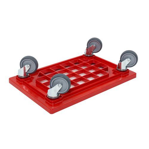 Rekeszszállító kocsi erős szerkezettel és 250 kg teherbírással. A középső kocsirácsozás lehetővé teszi a szokatlan méretű rekeszek és csomagok kezelését. Az emelvény kiváló sérülésálló ABS műanyagból készül. A mozgásról 4 csendes, csúszó csapágyas forgó görgő gondoskodik. Alkalmas élelmiszeripari felhasználásra.