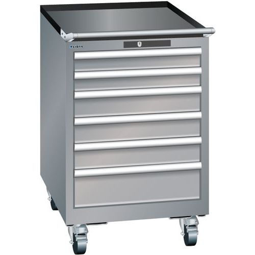 Bordázott csúszásgátló alátét a szekrény tetején. 4 kerék és egy fogantyú teszi lehetővé a mozgást. Kulcsos zár. Optimális használat a teljes kihúzásnak és az optimális fiókelőlap-magasságnak köszönhetően. Kiváló védelem a por, folyadékok és mechanikai kopás ellen a zárt keretnek köszönhetően, amelynek felülete ütés- és kopásálló. Borulásgátló rendszer, amely megakadályozza a fiók leesését, és egyedi fiókzár. Korrózióvédelem elektroforetikus merítéses festéssel és szórással. Optimalizált tárolóhely és rendszerezés a minden egyes alkalmazáshoz igazított LISTA elválasztóknak és a hornyokkal és perforációkkal ellátott fiókoknak köszönhetően. Professzionális címkézés LISTA Script címkézőszoftverrel és felhajtható címketartóval. Tökéletesen csendes mozgás a keresztléc nélküli csúszkának köszönhetően. A fiókelválasztók nem tartozékok. Külön kell megvásárolni. Max. terhelés (kg) : 75 kg
