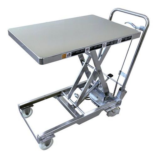 Rozsdamentes acél emelőasztal, ideális gyógyszer-, vegy- és élelmiszeriparban, kórházakban és éttermekben. Minden alkatrész rozsdamentes acélból készül, kivéve a szivattyút és a hengeregységet, amely horganyzott acélból készült. A pedál segítségével emelje fel az emelőkosárt, majd engedje le a kézi karral. Könnyű kezelhetőség a tolórúdnak, két forgó görgőnek (köztük az egyik fékkel) és két fix görgőnek köszönhetően.
