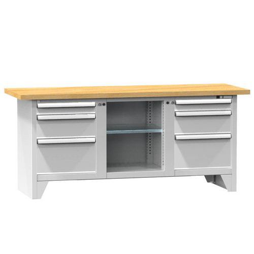Az asztaltest alapfelszereltségéhez tartozik egy központi zár a fiókokhoz minden modulban. Minden típushoz előre meghatározott munkaasztalokat kínálunk, többféle szélességben és mélységben.