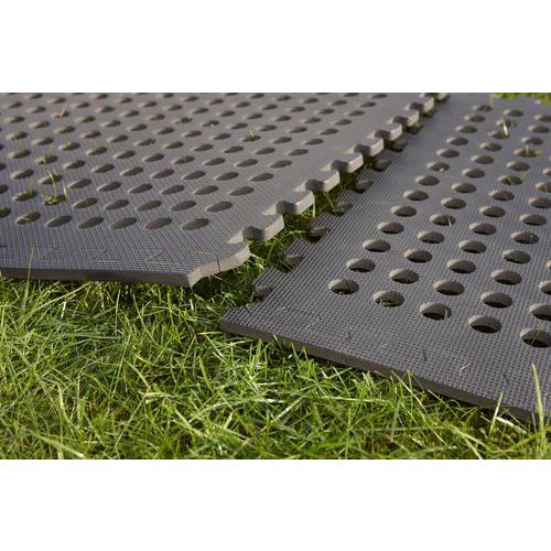 PE lábtörlő moduláris kivitelben. Ideális megoldás nedves területekhez és nagy forgalomhoz. Az egyes részek perforálása elősegíti a vízfelvételt. Hozzájárul a helyek tisztaságához a homok, por, talaj, kövek stb. szűrésével.