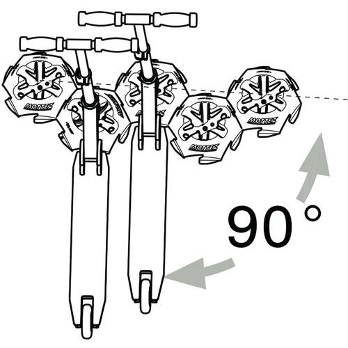 Robogóállvány átgondolt kialakítással, minden modellel kompatibilis. A megfelelő távolság megtartása érdekében kettőt egymásra lehet helyezni. Kerékszélesség kompatibilitás: minden kerék 25 és 38 mm között. A robogó állványai a középső tengelyen lévő furat segítségével rögzíthetők a talajhoz.
