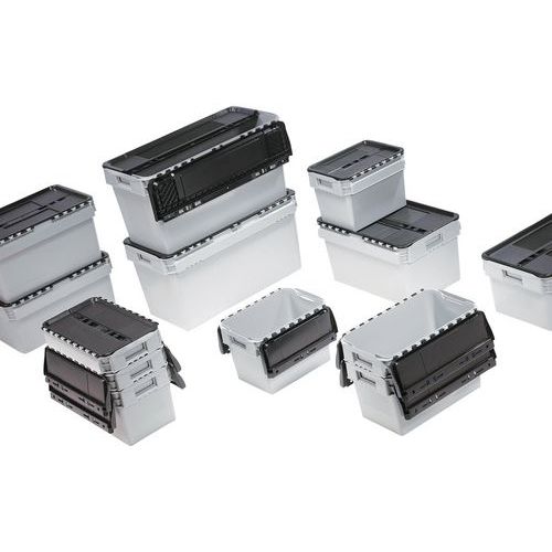 Dobozok megfelelő kezelése görgős szállítószalagokon. A konténerek egymásra és egymásra rakhatók. Egyszerű és gyors zárás. Tömítő zsanérok a hatékonyabb záráshoz.