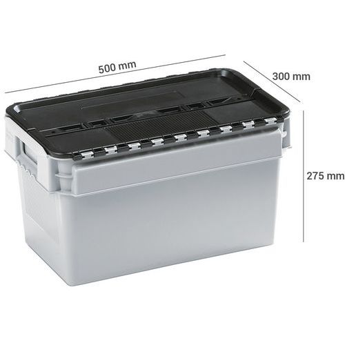 Dobozok megfelelő kezelése görgős szállítószalagokon. A konténerek egymásra és egymásra rakhatók. Egyszerű és gyors zárás. Tömítő zsanérok a hatékonyabb záráshoz.
