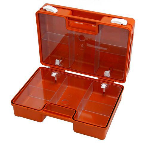Műanyag elsősegélynyújtó táska fali tartóval, 25 x 33,5 x 12,3 cm, RAKTÁR felszereléssel