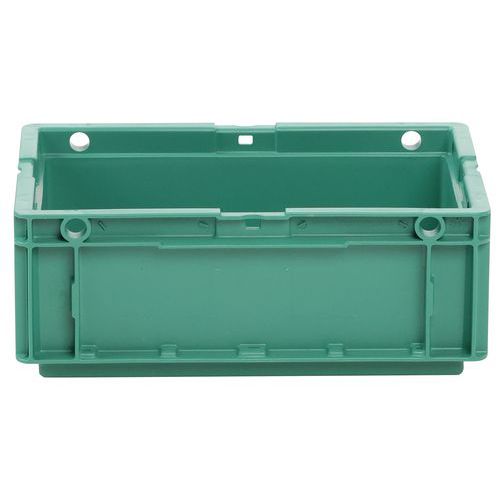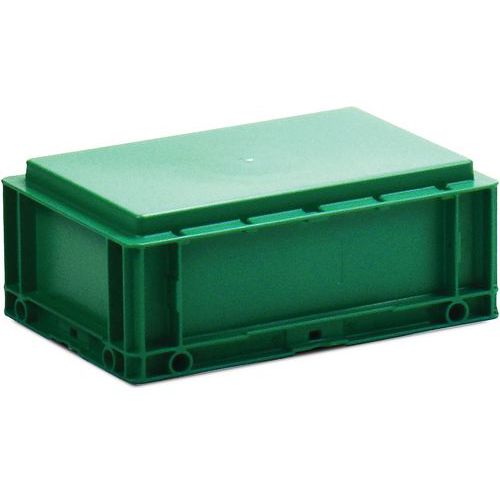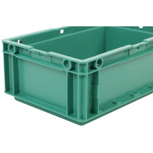 Nagyon robusztus, egymásra rakható műanyag dobozok zöld kivitelben. Magas halmozási stabilitás a megerősített éleknek köszönhetően.