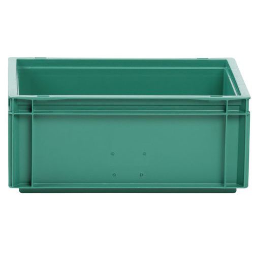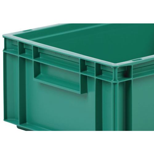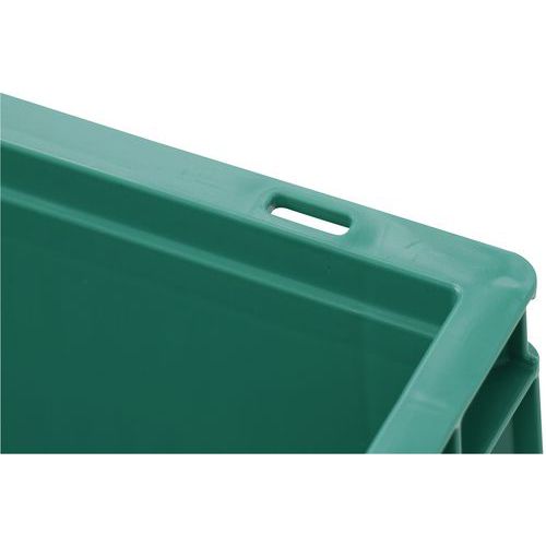Nagyon robusztus, egymásra rakható műanyag dobozok zöld kivitelben. Magas halmozási stabilitás a megerősített éleknek köszönhetően.