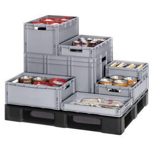 Műanyag Euro rekeszek a rakásolhatóságot és a tárolást megkönnyítő egyenes fallal és moduláris méretekkel rendelkeznek. Kényelmes fogantyúk, belülről sima felület az egyszerű tisztításért. A fedelek külön megvásárolhatók. Alkalmas hengergörgős szállítószalagokon történő használatra. A ládák alkalmasak az élelmiszeripar számára.