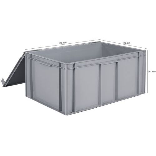 Rögzített csuklós fedél a könnyebb nyitás és zárás érdekében. Az áruk tömítőlyukakkal vannak rögzítve. Bordaszerkezet integrált fogantyúkkal a fokozott terhelésállóság érdekében. Kompatibilis az európai szabványos modellekkel. Amikor s b -re rakod a konténerek 7 mm-rel nyúlnak ki. Ezért a verem magassága kb A 129 mm 122 mm volt. Max. terhelés (kg) : 60 kg Gyártói garancia az ügyfélnek : 3 év