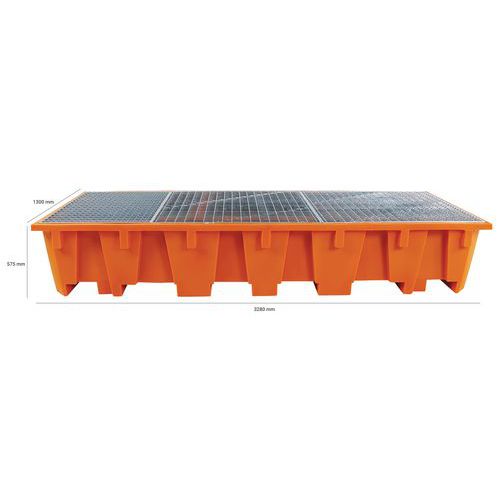 Műanyag kármentő tálca 1650 literes tárolókapacitással. Alkalmas 2 IBC-tartály tárolására. Polietilénből készült, nem rozsdásodik, és vegyszerálló. A tálca magasemelő targoncával mozgatható. Rácsos, műanyag rácsos vagy galvanizált acélrácsos kivitelben kapható.