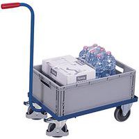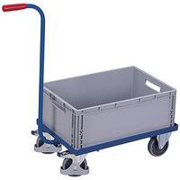 Platós kocsi 600 x 400 mm-es műanyag ládával. Egyszerű tolófogantyú. Szürke, nyommentes, termoplasztikus gumi kerekek műanyag felnin, precíziós golyóscsapágyakkal, lábvédelemmel. Két fix és két forgó kerék fékkel. Vázfelület-kezelés RAL skála szerinti porfestékkel. Ütés- és karcálló.
