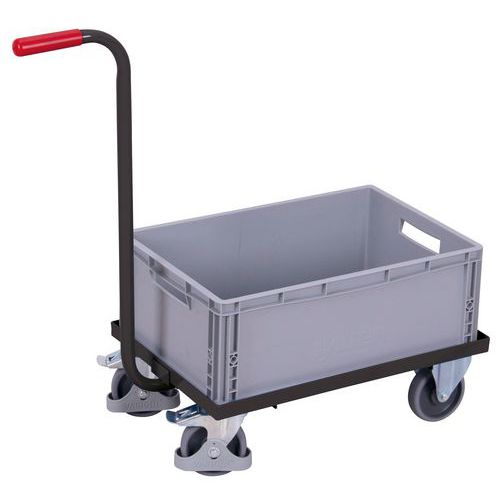 Platós kocsi 600 x 400 mm-es műanyag ládával. Egyszerű tolófogantyú. Szürke, nyommentes, termoplasztikus gumi kerekek műanyag felnin, precíziós golyóscsapágyakkal, lábvédelemmel. Két fix és két forgó kerék fékkel. Vázfelület-kezelés RAL skála szerinti porfestékkel. Ütés- és karcálló. Teherbírás (kg) : 250 kg