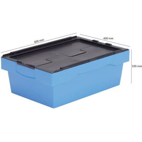 A logisztikai folyamatok azonosítását színkódos fedelek segítik. Többcélú, kézi és automatizált kezelésre is alkalmas. A tartalom zárható és zárható fedéllel van rögzítve. Az üres konténerek egymásra rakhatók és egymásra rakhatók a helytakarékosság érdekében. Gyártói garancia az ügyfélnek : 3 év Max. terhelés (kg) : 25 kg